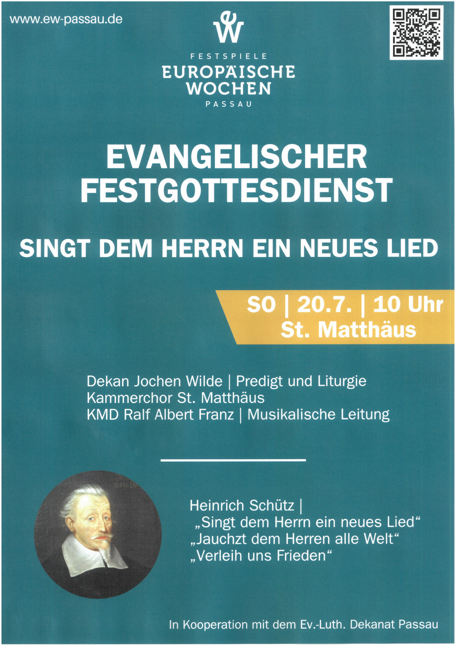 Im Rahmen der Festspiele "Europäische Wochen" Passau findet am Sonntag, 20. Juli 2025 um 10:00 Uhr in der Evang. Stadtpfarrkriche St. Matthäus der Evangelische Festgottesdienst "SINGT DEM HERRN EIN NEUES LIED" statt.